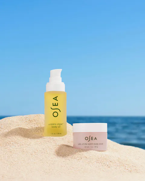 Set of OSEA skincare products including a jar, body wash, oil, and lotion on a white background.